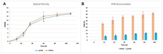 The resulting strain from sequential transformation (by pCV35, pCV88, and pCV342 plasmids) showed a significant increase in PHB content compared to the strain modified by pZX30, without any detectable effect on the growth rate (Figure 4A). The sequential transformation led to a strain capable of accumulating PHB at up to 41% of CDW, which is remarkably higher than the 11% PHB titer in the pZX30 strain (Figure 4B).