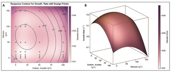 (A) A 2D contour plot indicating the optimum levels of substrates for maximum growth rate; (B) 3D surface plot shows the effect of glucose and sodium acetate on modified strain’s growth rate.