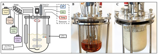 (A) Schematic diagram of the fed-batch bioreactor; (B) bioreactor before inoculation and fermentation; (C) bioreactor at the end of fermentation using Y. lipolytica PHB32.