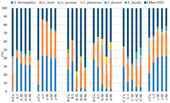 - Randazzo, C.L.; Torriani, S.; Akkermans, A.D.; de Vos, W.M.; Vaughan, E.E. Diversity, dynamics, and activity of bacterial communities during production of an artisanal Sicilian cheese as evaluated by 16S rRNA analysis. Appl. Environ. Microbiol. 2002, 68, 1882–1892. [Google Scholar] [CrossRef] [PubMed]