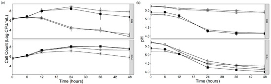 Duplicate laboratory scale fermentations were conducted twice. The pre-culture was inoculated into the respective soy whey at a 1% (v/v) inoculation ratio to obtain an initial cell count of ~5 log CFU/mL. Aliquots of 40 mL or 10 mL were then transferred to 50 mL or 15 mL centrifuge tubes, respectively. Incubation was at 37 °C for the 48 h fermentation period before the 15 mL tubes were then transferred to 4 or 25 °C aerobic storage. Sampling was conducted at 0 h, 6 h, 12 h, 24 h, 36 h, and 48 h using the 40 mL aliquots and at 1 week, 2 weeks, 3 weeks, and 4 weeks using the 10 mL aliquots. pH measurement was performed with a pH meter (827 pH Lab, Metrohm, Herisau, Switzerland), °Brix with a refractometer (RX-5000α, ATAGO, Tokyo, Japan), and cell count with pour plating on MRSC agar incubated for 48 h at 37 °C in an anaerobic jar with AnaeroGen™ (Oxoid Ltd., Hampshire, UK).