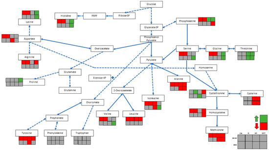 Figure 2 illustrates the predicted amino acid metabolism pathway based on Lee & O’Sullivan (2010) [11] and the Kyoto Encyclopedia of Genes and Genomes (KEGG). Table S1 details the changes in free amino acids before and after supplementation and fermentation. The data reveals that GC and GCY supplementation led to a non-significant change in the total amino acid content except for strain Bl-04 in GCY soy whey, which showed a significant decrease. CN and G supplemented soy whey had significant decreases in the total amino acid only after fermentation with Bl-04. The minimal nutrients in CN soy whey and lack of cysteine in CN and G samples were not optimal for bifidobacterial growth. However, Engevik et al. (2021) [32] reported that amino acids can be used as a nutrient source for B. dentium, which could explain the significant reduction in total free amino acids [32]. The majority of amino acids showed a significant decrease with the exception of cystathionine in G soy whey fermented with Bl-04, although specific changes varied with individual amino acids (Figure 2).