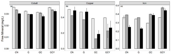 ) Bl-04 or B94 fermented (■) soy whey with different supplements, where CN = control, G = glucose supplemented, GC = glucose and cysteine supplemented, GCY = glucose, cysteine, and yeast extract supplemented: (a) cobalt, (b) copper, (c) iron. Error bars represent mean ± SD. Refer to Supplementary Table S2 for the detailed statistical interpretation and mineral composition of soy whey.