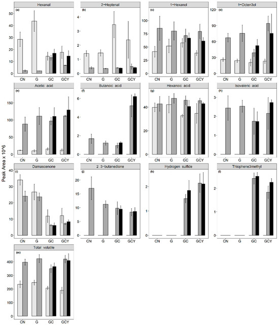 ) Bl-04 or B94 fermented (■) soy whey with different supplements, where CN = control, G = glucose supplemented, GC = glucose and cysteine supplemented, GCY = glucose, cysteine, and yeast extract supplemented: (a) hexanal, (b) 2-heptenal, (c) 1-hexanol, (d) 1-octen-3-ol, (e) acetic acid, (f) butanoic acid, (g) hexanoic acid, (h) isovaleric acid, (i) damascenone, (j) 2,3-butanedione, (k) hydrogen sulfide, (l) thiophene-3-methyl, (m) total volatile. Error bars represent mean ± SD. Refer to Supplementary Table S3 for the detailed volatile composition of soy whey and statistical interpretation.