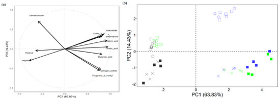 PCA plots of volatile components in fermented soy whey: (a) loading plot and (b) score plot. ○ CN = control, □ G = glucose supplementation, X GC = glucose and cysteine supplementation, ■ GCY = glucose, cysteine, and yeast extract supplementation.