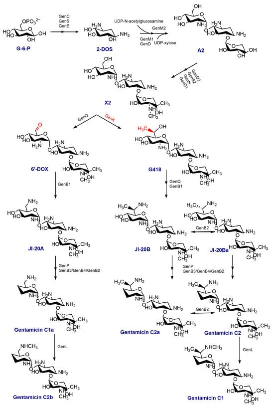 Gentamicin, an aminoglycoside antibiotic, holds significant clinical significance in the field of medicine [,]. This antibiotic binds to the aminoacyl site on 16 S rRNA of the 30 S subunit in the bacterial ribosome, disrupting protein synthesis and inhibiting bacteria []. Moreover, gentamicin exhibits potential in treating various genetic disorders associated with mutations in the amino acid coding sequence or premature termination codons (PTCs) []. Gentamicin is a multicomponent antimicrobial drug produced by Micromonospora echinospora. It contains a 2-deoxystreptamine (2-DOS) ring on C4 and C6, which is connected through glycosidic bonds to garosamine and purpurosamine. The majority of the enzymes used in the synthesis of gentamicin have been extensively elucidated [,,,,,,,,]. The process of synthesizing gentamicin begins with D-glucose-phosphate, which is converted into 2-DOS by the isomerase GenC, the aminotransferase GenS1, and the dehydrogenase GenE. This product is then utilized as a substrate for loading one molecule each of UDP-N-acetylglucosamine and UDP-xylose at C4 and C6, respectively, with the help of the glycosyltransferases GenM1 and GenM2. As a result, the initial trisaccharide-like intermediate, gentamicin A2, is formed. In a series of enzyme-catalyzed reactions, gentamicin A2 is converted to gentamicin X2, which is vital in the following set of parallel pathways. The C6′ methyltransferase, GenK, catalyzes the conversion of gentamicin X2 to G418 []. Gentamicin X2 and G418 undergo a series of enzymatic reactions, resulting in their conversion to gentamicin C1a, gentamicin C2a, and gentamicin C2. The N6′ methyltransferase, GenL, additionally catalyzes the conversion of gentamicin C1a and gentamicin C2 into gentamicin C2b and gentamicin C1 []. The detailed scheme of gentamicin biosynthesis is given in Figure 1. It is composed mainly of gentamicin C1, gentamicin C1a, gentamicin C2 and C2a, as well as trace amounts of intermediates or byproducts. Due to the difficulty in isolating major and minor components, the gentamicin currently in use is a mixture whose primary ingredient is the gentamicin C fraction, comprising gentamicin C1, C2, C2a, C1a, and C2b (Figure 2).