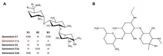 However, side effects such as ototoxicity and nephrotoxicity, common to aminoglycoside antibiotics, have limited the use of gentamicin []. A new broad-spectrum antibiotic, etimicin, which effectively fights against most Gram-positive and Gram-negative bacteria, can remedy these issues [,]. Etimicin is an aminoglycoside antibacterial with gentamicin C1a as its “mother nucleus”, i.e., an ethyl group is introduced at the N1 position of gentamicin C1a (Figure 2). It is the first antimicrobial drug with independent intellectual property rights in China and was introduced to the Chinese market in 1999. It is widely used in China due to its high antimicrobial activity, broad antimicrobial spectrum, and low incidence of side effects []. The industrial production of etimicin requires a significant quantity of high-purity gentamicin C1a. As a result, many researchers have employed genetic engineering techniques to develop strains that produce high yields of single-component C1a [,,,].