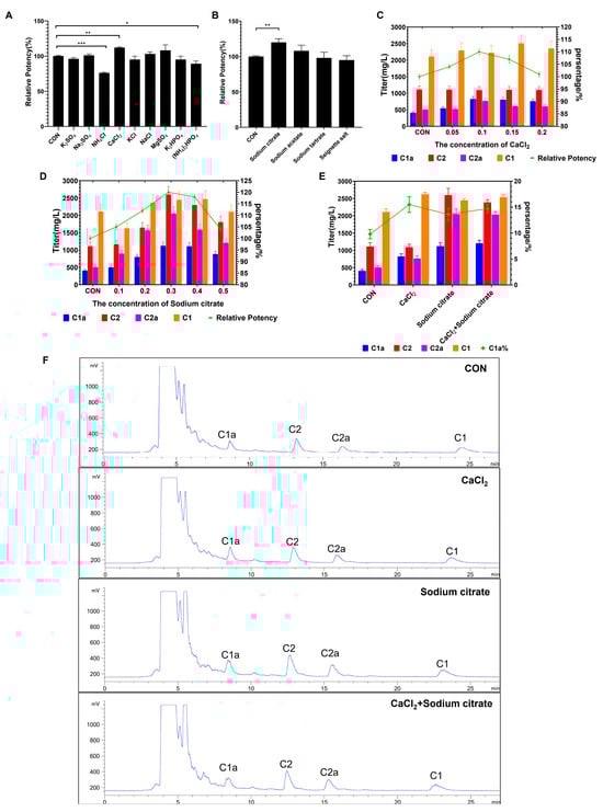 Effects of adding inorganic salt and organic acid salt to medium during fermentation process on the gentamicin production in flask culture. (A) Relative potency of gentamicin after adding different types of inorganic salts to culture media. (B) Relative potency of gentamicin after exposure to different types of inorganic salts. (C) Effects of CaCl2 concentrations on titers of gentamicin C complex and relative potency. (D) Effects of sodium citrate concentrations on titers of gentamicin C complex and relative potency. (E) Effects of added CaCl2 and sodium citrate on titers of gentamicin C complex and C1a proportion. (F) The chromatogram of each treatment group. * represents p < 0.05, ** represents p < 0.01; *** represents p < 0.001.