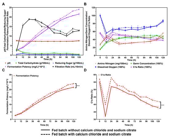 Effects of adding 0.1% CaCl2 and 0.3% sodium citrate in fermenter culture by the fed-batch method on fermentation indicators and production of gentamicin. Comparisons between two processes in the presence and absence of 0.1% CaCl2 and 0.3% sodium citrate in terms of pH, total carbohydrate, reducing sugar, filtration rate (A), amino nitrogen, dissolved oxygen, germ concentration (B), fermentation potency (C), and C1a ratio (D). *** represents p < 0.001.