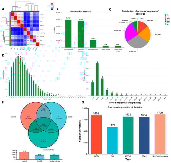 Bioinformation analysis of proteomics of M. echinospora. Sodium citrate or CaCl2 was introduced into the M. echinospora broth at the start of fermentation and incubated continuously. Three sets of replicated cultures were sampled over a 96 h fermentation period. Proteomic analysis was conducted using a label-free approach. The proteomic analysis was conducted using a label-free method. The data were subjected to analysis using the online platform Majorbio Cloud Platform (www.majorbio.com (accessed on 22 November 2023)). (A) The correlation among varying treatment samples. The green, dark blue, red on the edge present different groups, which mean the sodium citrate group, the control group, and the CaCl2 group, respectively. (B) Detected statistics for peptides’ and proteins’ information. (C) Distribution of proteins’ sequences’ coverage. (D) Peptide length distribution. (E) Protein molecular weight distribution. (F) Venn diagram for the proteins in the sodium citrate, CaCl2, and control treatment groups. (G) Protein function annotation (COG, GO, KEGG, and Pfam) results of M. echinospora.