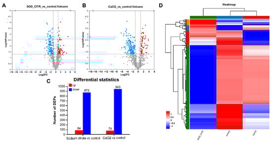 The differentially expressed proteins (DEPs) in different treatment groups. (A) Volcano plot of DEPs in the sodium citrate and control groups; (B) volcano plot of DEPs in the CaCl2 and control groups; blue polka dots indicate proteins with p-value less than 0.05, i.e. −log10 (p value) > 1.30 and fold change less than −2, i.e. log2FC < −1; red polka dots indicate proteins with −log10 (p value) > 1.30 and log2FC > 1, and gray polka dots represent other proteins. (C) numbers of differentially expressed proteins in different treatment groups. (D) Hierarchical clustering analysis of the DEPs among the sodium citrate, CaCl2, and control groups. The green, dark blue, and red at the top represent the sodium citrate group, the control group, and the CaCl2 group, respectively. The green, red, dark blue, and orange on the left side mean different subclusters which are classified by the protein expression levels.