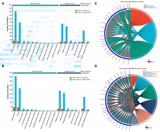 GO analysis and subcellular location of differentially expressed proteins (DEPs) in M. echinospora treated with CaCl2 or sodium citrate groups, respectively. (A,B) GO annotations analysis of DEPs. The blue-green columns on these maps indicate proteins that are downregulated, and the orange columns indicate proteins that are upregulated. These maps display the top 20 GO terms for abundance. (C,D) Chordal map of GO enrichment analysis of DEPs. The maps illustrate the 50 most important protein targets containing a significant number of annotated GO terms. Additionally, the 15 most significant GO terms featuring these target proteins are displayed based on the p-value of the enrichment results.