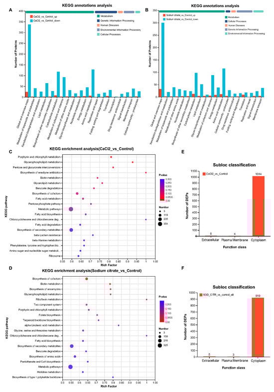 KEGG analyses and subcellular locations of DEPs that were markedly differently expressed in M. echinospora treated with CaCl2 or sodium citrate groups, respectively. (A,B) KEGG annotations analysis of DEPs. The downregulated proteins are represented by blue-green columns; upregulated proteins are represented by orange columns. These maps show the top 20 KEGG terms for abundance. (C,D) Bubble maps of GO enrichment analyses of DEPs. The top 20 pathways were selected based on the p-value. (E,F) Subcellular location classifications of DEPs.