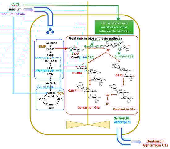 Gentamicin biosynthesis is not only related to the biosynthesis and assembly of gentamicin but also to the metabolism of carbohydrates []. This is mainly because glucose-6-phosphate is an important precursor of gentamicin (Figure 1). As we can see from Figure 9, phosphofructokinase (A0A1C4YCI0) and pyruvate kinase (A0A1C4YHB7) levels were decreased in the glycolytic pathway (EMP), with the fold changes of 0.19 and 0.22, respectively; the citrate synthase (A0A1C5A2F4) level was decreased in tricarboxylic acid (TCA), with the fold change of 0.41 (Table S2, Supplementary Figures S2 and S3). The addition of sodium citrate significantly downregulated these three key enzymes, resulting in a weakening of the glycolytic pathway and inhibition of glucose consumption by the TCA pathway, consistent with the literature reports [,,]. Furthermore, NADH and FADH2 cofactors were predominantly synthesized via the TCA cycle. The presence of sodium citrate hindered the glycolytic and TCA pathways, which resulted in a noteworthy reduction in cofactor biosynthesis in the KEGG analysis. GO enrichment analysis revealed a significant decrease in the process of cellular modified amino acid biosynthesis and metabolism, which could be a result of the downregulation of the primary metabolic process. The overall decrease in aminotransferase during gentamicin synthesis after adding sodium citrate (Table S2) could conceivably be influenced by these changes. Importantly, despite the diminishment of these enzymes, there was no concomitant decrease in the synthesis of gentamicin (Figure 3E). Therefore, the biosynthesis of gentamicin utilized higher amounts of glucose, which explains the significant increase in its overall effectiveness when added to sodium citrate (Figure 9).