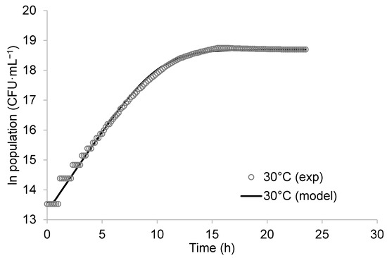 The population of K. unispora in the fermenter at 30 °C is plotted as a function of time in Figure 1. The primary models (Equation (1)) exhibited a good fit with the experimental data. From this regression, the specific growth rate obtained at 30 °C and pH 5.6 was 0.55 ± 0.01 h−1. Rough calculations of K. unispora growth from graphs in Korcari et al. [21] revealed a growth rate of approximately 0.5 h−1, which is comparable to our value. In comparison, the Saccharomyces cerevisiae growth rate ranges from 0.38 to 0.57 h−1 [22].