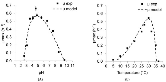To understand the effect of pH and temperature on K. unispora growth, specific growth rates were identified from experimental data obtained from 5 °C to 40 °C at a fixed pH of 5.6 (Figure 2A) and from pH 1.8 to 9.6 at a fixed temperature of 30 °C (Figure 2B). Again, the CTPM model fitted the experimental data (Equation (3)). The results showed that the optimal pH pHopt and temperature Topt for K. unispora were equal to 4.81 ± 0.22 and 30.16 ± 0.53 °C, respectively, with µopt of 0.57 ± 0.02 h−1. The minimal and maximal growth temperatures were Tmin = 3.8 ± 3.33 °C and Tmax = 35.7 ± 0.20 °C, while the maximal and minimal growth pH values were pHmin = 2.6 ± 0.09 and pHmax = 9.6 ± 0.30. These parameters can be used to represent K. unispora growth kinetics at any temperature and pH.