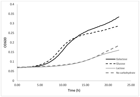 The effect of the substrate (lactose, glucose, and galactose) was investigated at the optimal temperature of 30 °C using the Bioscreen C MBR device. As expected, the K. unispora specific growth rate was high in the glucose media with µopt of 0.45 ± 0.01 h−1. Interestingly, the K. unispora specific growth rate was the same in galactose. In contrast to S. cerevisiae, no lag phase was observed in galactose [23]. The Ks value was 0.13 ± 0.04 mg·mL−1 for galactose, while, for glucose, it was 0.24 ± 0.03 mg·mL−1. These data mean that K. unispora can achieve its maximal growth rate even with a lower amount of galactose. As expected, the growth rate in 2% w/v lactose was 2.5-fold lower than in glucose or galactose, with a value of 0.18 h−1. This value was similar to growth in medium containing no carbohydrate (0.17 h−1), which confirmed that K. unispora does not consume lactose. The growth without carbohydrate could be explained by the use of peptones in the culture medium as a carbon source. The Bioscreen growth curves in different carbohydrates are presented in Figure 3.