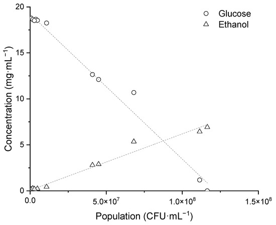 Among the studied LAB, only L. kefiri produces ethanol [15]. The content of ethanol in the L. kefiri coculture reached ~7.8 g·L−1, which was the same level as in the monoculture of this strain. On the other hand, 0.45 g·L−1 of ethanol was observed in L. casei fermentation, which is slightly below the amount that the K. unispora population (~9 × 106 CFU·mL−1) could produce. This indicates that K. unispora was very limited in its ethanol production in coculture with LAB due to its low population.
