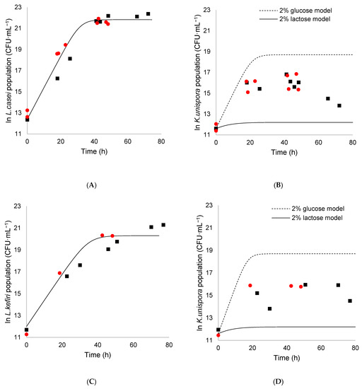 L. casei and K. unispora coculture (A,B), and L. kefiri and K. unispora coculture (C,D) with initial population of each strain of 105 CFU·mL−1 in modified MRS (■) and reconstituted mare milk (●). (A) Experimental L. casei population at 25 °C. (B) Experimental population of K. unispora at 25 °C. (C) Experimental L. kefiri population at 30 °C. (D) Experimental population of K. unispora at 30 °C. Lines represent theoretical monoculture growth in lactose (plain line) for LAB and in glucose (dotted lines) and lactose (plain line) for K. unispora.