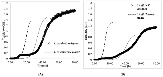 K. unispora was grown with two lactic acid bacteria, namely, L. casei and L. kefiri, in modified MRS and reconstituted milk. The growth of L. casei and K. unispora at 25 °C are presented in Figure 5A,B, while the growth of L. kefiri and K. unispora at 30 °C is presented in Figure 5C,D.