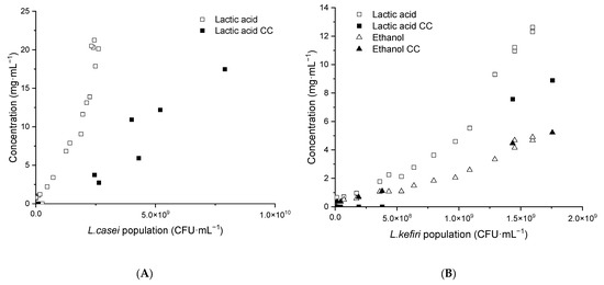 K. unispora coculture with (A) L. casei at 25 °C and (B) L. kefiri at 30 °C, with initial populations of each strain of 105 CFU·mL−1.