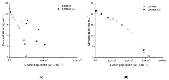 Interestingly, for L. casei, more than a twofold population increase was observed from a similar lactose change. This could be due to slower lactic acid production and, consequently, slower pH decrease in the coculture. Indeed, an increase in the initial population of L. casei to 107 CFU·mL−1 in coculture led to faster acidification and, consequently, to a lower final population of L. casei (3.1 × 109 CFU·mL−1).