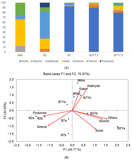 (A) Relative composition of VOCs in mare milk samples fermented with individual L. kefiri (B2) and L. casei (B7) and their cocultures with K. unispora (Y1.5). (B) PCA by class of organic compound.