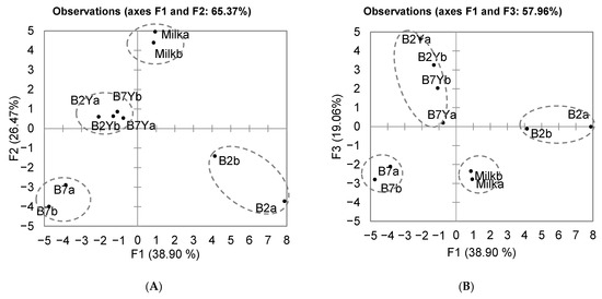 The PCA of VOC groups is shown in Figure 9B. The main factors of the PCA explained 72% of the variance. The results show that the mare milk mainly consisted of esters. Milk fermented with L. kefiri (B2) contained high amounts of ketones and pyrazines. Acids such as acetic, butanoic, and octanoic acids were the main compounds in L. casei (B7), L. casei–K. unispora (B7Y), and L. kefiri–K. unispora (B2Y) samples. The full VOC composition of each sample according to the compound groups is presented in Table S1 of the Supplementary Materials. PCA analysis of all VOCs is presented in Figure 10. Four distinct groups were identified: L. kefiri only (B2a,b), L. casei only (B7a,b), LAB–K. unispora (B2,7Y), and the milk group. The main factors of the PCA explained 65% of the variance (Figure 10A). Due to proximity of the coculture group to the center of the PCA, the PCA with factors 1 and 3 is also provided for better separation (Figure 10B).