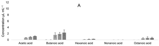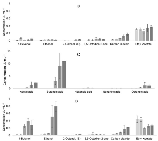 Samples from different times during fermentation were also analyzed at 0, 19, 42.5, 114, and 138 h. The results of the evolution of VOCs can be seen in Figure 11A,B for the L. casei–K. unispora coculture, and Figure 11C,D for the L. kefiri–K. unispora coculture.