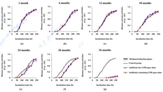 With respect to vitality, keeping the recombinant enzyme activity of the cells is equally important. We found that all three cultures showed similar trends in the biomass enzyme activity profiles (i.e., the biomass enzyme activities were almost linearly increased during the methanol induction phase), and at each time point, the biomass enzyme activities are also very similar in the first four preservation groups (1 month, 6 months, 12 months, 18 months) (Figure 3a–d). At the 24th month and 30th month (Figure 3e,f, Table S2), although the biomass enzyme activity profiles of the cultures from the antibiotic-free and antibiotic-containing YPD agar slant had no apparent change compared with that of the control, the delayed methanol induction in the two cultures resulted in the curves of the biomass enzyme activity drifted apparently to the right of the control (Figure 3e,f, Table S2). However, by the end of the fermentation, the biomass enzyme activities of the two cultures (i.e., the antibiotic-free and antibiotic-containing YPD agar slant) in these two groups (24th-month and 30th-month groups) were much similar to that of the control, both of them have caught up with that of the control at 220 h and 244 h of total cultivation, respectively (both corresponding to the 7th day of methanol induction), in which the glycerol cultivation phase was longer (i.e., lasted for 52 h and 76 h, respectively) but the methanol induction phase was shorter compared with those of the control (Figure 2e,f, Table S1, Figure 3e,f, Table S2). At the 36th month (Figure 3g), the biomass enzyme activities of the two cultures were drastically reduced compared with that of the control, which was consistent with the dramatic change in cell vitality (Figure 2g), indicating that after the 36 months of preservation, the strain had almost lost its enzyme production ability. These results demonstrated that the engineered yeast grown in the YPD slant could be kept at 4 °C for at least 30 months before it was used for fermentation. Additionally, the heterologous Lxyl-p1-2 gene on the chromosome of the host strain was quite stable and could not be easily lost during the preservation. Thus, the antibiotic (G418) added in the agar slant could be omitted.