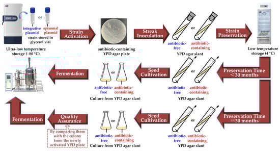 Whether or not the long-term agar-slant preservation can be applied to other yeast species, such as Sacharomyces cerevisae, another well-known host in industrial fermentation, requires further investigation. Finally, we proposed a workflow diagram of the procedure for the future preservation and fermentation of the recombinant yeasts, which is based on our results present in this work (Figure 5). If the recombinant gene is carried by an episomal plasmid, we suggest that the antibiotic should be added to the agar slant. If the low-temperature storage lasts for 30 months, we suggest that a pre-experiment should be done before the formal fermentation to ensure the vitality and production ability of the strain by comparing it with the newly activated single colony from the YPD plate on which the strain was inoculated from the ultra-low temperature storage.