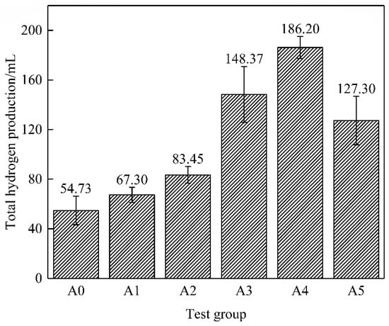 The total hydrogen production achieved with different contents of corn straw was plotted in Figure 1. The total hydrogen production was 54.73, 67.30, 83.45, 148.37, 186.20, and 123.35 mL with 0%, 10%, 20%, 30%, 40%, and 50% corn straw, respectively. These values were 22.97%, 52.48%, 171.09%, 240.22%, and 125.38% greater than those in the control group without corn straw, respectively. The results showed that corn straw could increase the total hydrogen production from lignite. The group with 40% corn straw showed the highest total hydrogen production and was the most promising. The microbial activity was improved because corn straw is rich in nitrogen []. Chen et al. found that the addition of Fe3+ and Ni2+ also increased hydrogen production by increasing microbial activity []. However, the effect of adding 50% corn straw in hydrogen production from lignite was lower than that of adding 40% corn straw. This was because in the fermentation process of the A5 group, more CO2 was generated, impairing the microbial activity in the system [].