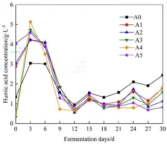 The humic acid concentration achieved with different contents of corn straw is shown in Figure 3. Because a large amount of humic acid was consumed and hydrogen was produced in the experimental groups on the first day, the concentration of humic acid was lower at the beginning of fermentation. The concentration of humic acid in the control group and experimental A1, A2, A3, A4, and A5 groups was 1.34, 2.89, 3.04, 0.33, 0.51, and 4.04 g/L, respectively. This was consistent with the A3 and A4 groups producing more hydrogen. At the same time, when 50% corn straw was added the concentration of humic acid was higher, but the daily gas output was lower because the high concentration of humic acid inhibited the activity of microorganisms and reduced the efficiency of conversion to hydrogen []. This is consistent with a study by Wang et al., wherein excessive water-soluble humic acid (fulvic acid) inhibited microbial activity in the fermentation system []. Then, the hydrogen production decreased and humic acid concentration increased. On the 3rd day, the concentration of humic acid from the control group and experimental A1, A2, A3, A4, and A5 groups was 3.04, 4.22, 4.23, 4.74, 5.14, and 4.60 g/L, respectively. The addition of corn straw increased the concentration of humic acid because the lignin in corn straw could be decomposed into phenolic compounds and then converted into humic acid [,]. Afterwards, humic acid was converted to benzoic acid, reducing the concentration during the fermentation process. On the 12th day, humic acid concentration decreased to 0.94, 0.63, 0.56, 0.71, 0.65, and 0.87 g/L with respect to the control group and A1, A2, A3, and A4 groups. This represented a decrease of 69.04%, 85.06%, 86.85%, 85.02%, 87.27%, and 81.09%, respectively, with respect to the 3rd day. This suggested that the biotransformation ability was stronger and more humic acid could be converted to hydrogen by adding 40% corn straw to the fermentation system, because humic acid was also promoting a microbial-mediated electron-transfer chain reaction [,,].