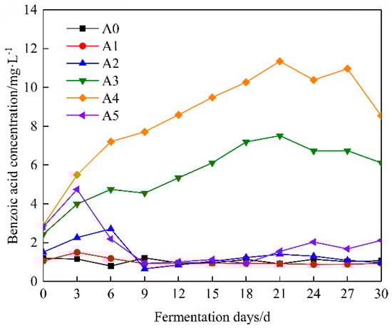 Figure 4 shows the benzoic acid concentration in different groups. There was no significant fluctuation in the concentration of benzoic acid from the control group and the A1 group during the fermentation process. The control group and the A1 group reached the maximum concentration of benzoic acid on the 3rd day, with 1.16 and 1.50 mg/L, respectively. However, the concentration of benzoic acid in groups A2, A3, A4, and A5 showed a trend of increase and then decrease. In addition, they all reached the concentration peak on different days, with 2.71, 7.52, 11.35, and 4.74 mg/L, respectively. This was consistent with the extent of humic acid degradation, because humic acid can be degraded to benzoic acid []. The group A4 showed that the concentration peak increased by 878.45% compared with that of the control group. Therefore, there was more benzoic acid to be converted to pyruvic acid, and then, hydrogen was produced []. This indicated that adding corn straw has significant enhancing effects on hydrogen productivity. Likewise, the addition of 40% corn straw had the most obvious enhancing effect on hydrogen production from lignite.