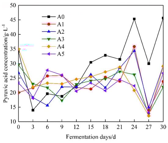 The effect of adding corn straw on pyruvic acid is shown in Figure 5. Similar trends were observed in different fermentation groups. Figure 5 shows that during fermentative hydrogen production from lignite, the pyruvic acid increase fluctuated but fell to a minimum on day 27. The minimum concentrations of pyruvic acid in the control group and experimental groups A1, A2, A3, A4, and A5 groups were 29.96, 13.98, 14.88, 12.62, 11.98, and 13.07 g/L, respectively. The pyruvic acid concentration reached the minimum with the corn straw content of 40%. On the 27th day, the pyruvic acid concentration of the control and A4 groups was 6.50% and 65.78% lower than that of the 3rd day, respectively. Pyruvic acid initiates decarboxylation to produce acetyl CoA and then hydrogen generation []. Therefore, the higher degradation degree of pyruvic acid in group A4 indicated that the enhancement of hydrogen production in group A4 was clear.