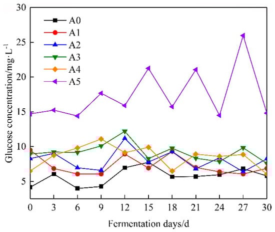 Figure 6 shows that the trends in glucose concentration in different fermentation groups were different. The minimum glucose concentration of the control group and experimental A1, A2, A3, A4, and A5 groups were 3.98, 6.05, 6.37, 7.57, 6.03, and 14.40 mg/L, respectively. The more corn straw was added, the higher the glucose content was, because corn straw is rich in cellulose that can be rapidly degraded into glucose []. The water solubility of lignite was poor, and it was difficult to break the bonds to produce glucose. However, the lowest glucose concentration in group A4 was even lower than that in group A3, indicating that 40% corn straw could enhance the microbiological activity [], thus, promoting the degradation of glucose and generating more hydrogen. However, the excessive corn straw reduced the glucose degradation, as a large amount of the carbon source dissolved from corn straw made fermentation change to an acid production stage []. Large amounts of acid reduced microbial activity, making glucose difficult to degrade, inhibiting hydrogen production.