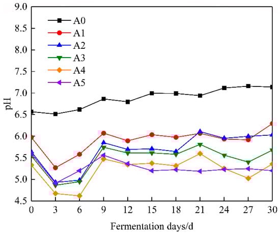 In the process of microbial fermentation, the pH was one of the main factors affecting microbial activity, which in turn, affects the hydrogen production and the stability of the fermentation system. The pH change in different lignite fermentation groups is shown in Figure 7. Because corn straw could produce acid substances, such as acetic acid, during fermentation, the pH value of groups with corn straw is low. On the 3rd day, the pH of all the fermentation groups decreased due to the production of acid substances such as humic acid. The pH of the control group and experimental A1, A2, A3, A4, and A5 groups was 6.51, 5.27, 4.93, 4.86, 4.67, and 4.91, respectively. The A4 group exhibited the smallest value of pH, which indicated that more acidic substances were converted into hydrogen in the early stage of fermentation. This is consistent with the results of Xia et al., who found that the more acid content, the stronger the hydrogen production capacity []. Afterwards, the acid substance was consumed and the pH value increased.