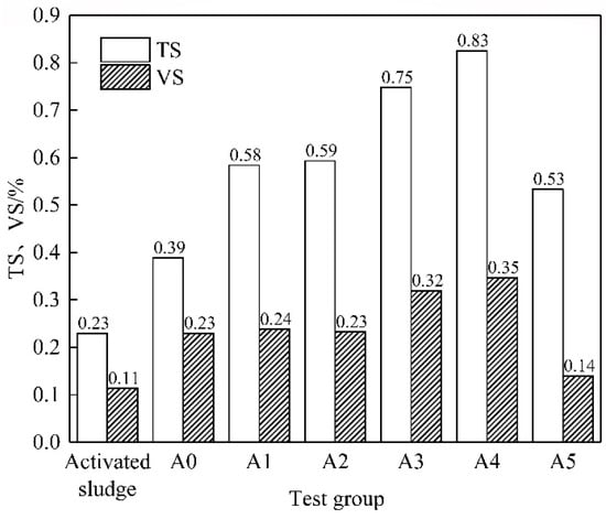 Figure 8 shows that the TS and VS contents of activated sludge were 0.15% and 0.08%. The increase in TS after domestication may be caused by the increase in suspended solids and the microbial reproduction number with corn straw and lignite. After domestication, because organic matter content increased in soluble substances, the VS content increased []. With this, the organic matter content was higher and the hydrogen fermentation ability stronger. With the increase in exogenous corn straw contents, the TS and VS of the fermentation liquid increased and then decreased. TS and VS reached the maximum at a corn straw content of 40%, which increased by 112.82% and 52.17% compared to the control group. Therefore, adding 40% corn straw is better to enhance hydrogen production.