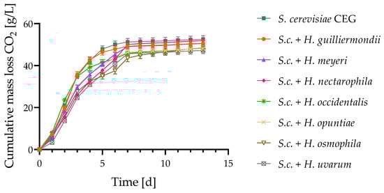 Co-fermentations using Hanseniaspora strains with S. cerevisiae were carried out at 22 °C using 10:1 ratios of starting cultures. The progression of these fermentations was followed by daily measurements of CO2 mass-loss (Figure 1). All fermentations were completed by 13 days, which was also confirmed by the HPLC analysis indicating that all fermentations reached dryness (Table 1). There were some deviations in the mass-loss patterns, with some co-fermentations (H. occidentalis, H. osmophila and H. nectarophila) exhibiting slightly less mass-loss throughout the fermentation, yet no notable fermentation burden was observed with any of the co-inoculations. This is in concurrence with previous Hanseniaspora-initiated fermentations, where no meaningful influence on the fermentation rate of S. cerevisiae was observed []. CEG is known for its slow fermentation performance. This was also the reason why we decided to use this Saccharomyces yeast.