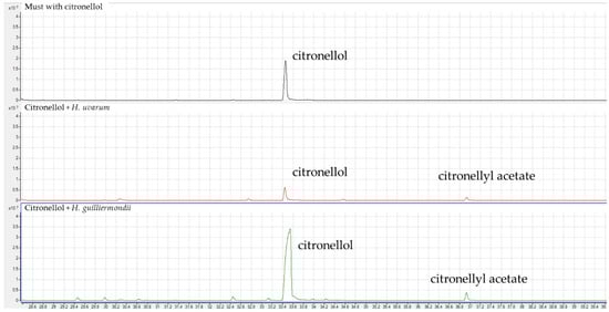 Typical of GT must is that it has a high terpene potential. Terpenes are often bound to sugar moieties in grape must and require deglycosylation for their release, in order to be perceived. This release can be facilitated enzymatically via the action of β-glucosidases or non-specific β-glucanases and it has been shown that NSY, including Hanseniaspora spp., have superior terpene-releasing abilities than Saccharomyces [,,,]. The conversion of terpenes can also occur, which can be catalyzed by several enzymes, including dehydrogenases, oxygenases and reductases []. Table 3 shows the terpene content of the GT wines co-fermented with the different Hanseniaspora spp. We observed in certain cases significant modulation of the terpenes within the co-fermentations. With H. opuntiae, in particular, many of the terpenes were significantly affected like citronellol and β-myrcene, which is suggestive of the release of terpenes from sugar moieties. Curiously, with some co-fermentations (H. guilliermondii, H nectarophila and H. uvarum) citronellol levels were significantly lower than those of the control. A short fermentation of must spiked with higher levels of citronellol in wines co-fermented with H. guilliermondii and H. uvarum was conducted to see if other peaks related to citronellol could be observed. A peak corresponding to the acetate ester of citronellol (i.e., citronellyl acetate) was detected in the GC-MS chromatograms (Figure 2). This strongly suggests that these Hanseniaspora strains converted citronellol (which is a terpenol with a primary alcohol functional group) to its acetate ester, presumably via the same action as the esterification of other alcohols.