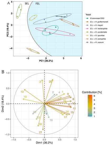 PCA of the final wines co-fermented with Hanseniaspora spp. All of the measured wine parameters, excluding the terpene data, were used to compose the PCA. Score plot (A) in the first two PCs: fermentation replicates are shown with the same shape and colour. The blue-and-white separation indicates the division of the two lineages (FEL and SEL). (B) Corresponding loading map. Each arrow relates to the tip of a vector starting from the origin. The closer the variable is to the circle, the better it is explained by the components. Contribution values (%) are shown in a gradient scale of colours with corresponding values. Numbers in the loading map correspond to: (1) ethyl acetate, (2) isobutanol, (3) ethyl propionate, (4) isoamyl alcohol, (5) 2-methyl-1-butanol, (6) ethyl butanoate, (7) hexan-1-ol, (8) isoamyl acetate, (9) 2-methyl-1-butyl acetate, (10) hexanoic acid, (11) ethyl hexanoate, (12) hexyl acetate, (13) 2-phenylethanol, (14) octanoic acid, (15) ethyl octanoate, (16) 2-phenylethyl acetate, (17) ethyl decanoate, (18) tartaric acid, (19) malic acid, (20) lactic acid, (21) acetic acid, (22) citric acid, (23) ethanol, (24) glycerol.