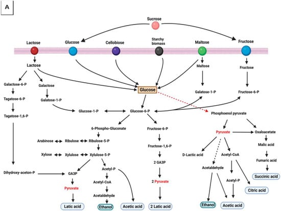 The production and consumption of fermented food is a potent strategy for addressing societal socioeconomic and health issues (including malnutrition, allergies, obesity, and aging) [20]. Fermentation processes regenerate NAD+ through redox reactions that result in pyruvate, its derivatives, and diverse other end-products. Pyruvate is a simple α-keto acid and major intermediate formed at the biochemical junction of glycolysis and the tricarboxylic acid cycle. Pyruvate precursors many valuable biomolecules [108,109]. Sugar, amino acids, and fatty acid-containing compounds are oxidized by transferring hydrogen ions from intermediate products to organic molecules such as pyruvate and acetyl CoA—which are final receptors for hydrogen ions [110]. The metabolism of these biomolecules results in flatus and fatty acids—critical modulators of hosts’ immune responses (see Figure 1A–C).