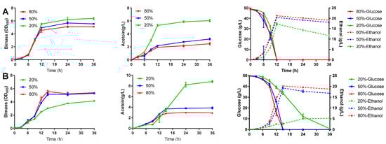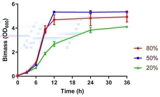 Growth curve of Z. mobilis under different conditions. 20%, 50%, and 80% represented corresponding conditions that 100-mL shake flasks contained 20, 50, or 80 mL RMG5, respectively. Values are the means of experiments with three or more technical replicates; error bars are standard deviations.