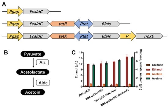 Nevertheless, acetoin is an oxidized product. which plays a crucial role in the regulation of the NADH/NAD+ ratio and is used as an external energy store by several fermentative bacteria. In the acetoin pathway, NADH produced from glycolysis could not be converted to NAD+ leading to a redox cofactor imbalance [,]. The unbalanced NADH/NAD+ ratio hinders the conversion of acetaldehyde to ethanol, and the accumulation of acetaldehyde will be toxic to cells. Thus, maintaining cofactor balance is crucial to sustaining cellular metabolism and helps improve acetoin production.