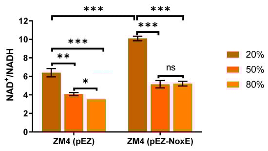 The NAD+/NADH ratios in the recombinant strains of ZM4 (pEZ) and ZM4 (pEZ-NoxE) strains. Strains were cultured in 100-mL shake flakes containing 20 mL (20%), 50 mL (50%) and 80 mL (80%) medium at 30 °C, 100 rpm. Values are the means of experiments with three or more technical replicates, and error bars are standard deviations. A p-value less than 0.05 is considered to be statistically significant (* p < 0.05; ** p < 0.01; *** p < 0.001). ns: not significant.
