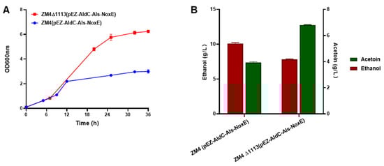 Growth curve (A) as well as the titers of ethanol and acetoin (B) of the recombinant strain ZM4 (pEZ-AldC-Als-NoxE) and ZM4 Δ1113(pEZ-AldC-Als-NoxE) cultured in flasks with the shaking speed of 200 rpm. Values are the means of experiments with three or more technical replicates, error bars are standard deviation.
