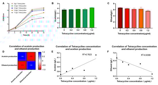 A sgRNA was then designed targeting pdc gene encoding pyruvate decarboxylase. The tunable CRISPRi was used to redirect carbon flux from ethanol to acetoin production by inhibiting the pdc expression using the CRISPRi system. Our results demonstrated that the interference of pdc through CRISPRi improved the acetoin production although its growth was affected (Figure 7A), and the titer of acetoin increased by 11.24% while the titer of ethanol decreased by 15.57% (Figure 7B,C). The correlation of acetoin production with ethanol production, and the correlation of tetracycline with acetoin production and ethanol production were then investigated. Our results indicated that the reduction of ethanol was positively correlated with the production of acetoin (Figure 7D), and the production of acetoin and ethanol had a linear correlation with the gradient of tetracycline concentrations (Figure 7E,F), as the production of acetoin was enhanced correspondingly to the increase in the tetracycline inducer concentrations, whereas the production of ethanol was decreased correspondingly to the increase in the tetracycline inducer concentrations within 0–1.2 μg/mL.