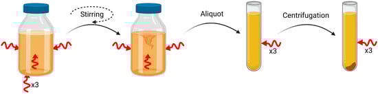 The sample was measured from two different angles to study the performance of the SORS spectrophotometer in each case: directly next to the fermentation glass container in the horizontal plane (three equidistant points) and at the bottom of the container in the vertical plane. Furthermore, to detect the possible effect of turbidity, the samples were also measured directly next to the container in the horizontal plane after vigorous stirring. In every case, the SORS technology was applied to avoid the effect of the container. A scheme of the different analysis arrangements is represented in Figure 1.