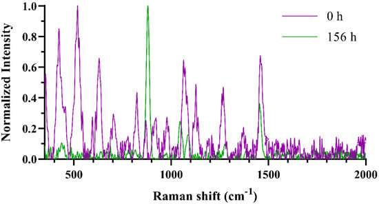 Figure 3 shows an example of the SORS spectra obtained at the beginning and at the end of the fermentation process. The main peaks in the first stage of alcoholic fermentation could be assigned to the vibration of different bonds belonging to the sugar molecules: 451 cm−1 for δ(C–C–O), 521 cm−1 for cyclic carbons, 1124 cm−1 for angular torsion and CH2 group at 1455 cm−1. Other important bands described in the alcoholic fermentation are C-O-H bending at 1424 cm−1, C-C stretching at 1130 cm−1 and C-O stretching at 1072 cm−1 []. As for the spectrum corresponding to the end of fermentation, the most characteristic band of ethanol assigned to the C-C stretching vibration around 880 cm−1 can be clearly seen [,].
