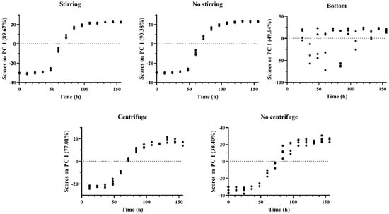 As shown in Figure 4, the evolution of the scores in the first principal component (PC) over time showed a process-related sigmoidal curve for each signal acquisition arrangement, except for the vertical measurement at the bottom of the sample container. This sigmoidal behaviour related to density evolution allows to stablish a monitoring of the process as stablished in our laboratory using mid-infrared spectroscopy and published in the following tutorial []. Regarding the process, after 96 h, a stabilization of the score values was observed, meaning that the first PC is not able to distinguish final stages of alcoholic fermentation, that end at hours 156 as previously mentioned (see paragraph 3.1). However, the second PC for “stirring” and “no stirring” PCA models showed an evolution over time in that period (Supplementary Materials Figure S1). This could be related to the final part of the consumption of sugars and the production of ethanol, as the loadings of this component are also related to sugars and ethanol. When looking at the reference samples (centrifuged and not centrifuged aliquots) they showed small differences in the score values of the first PC of the replicates at the end of the process, which could be related to biological variability. However, both configurations showed the same sigmoidal shape, and could be used to monitor the fermentation. Finally, in all cases the variance explained by the first PC ranges from 38.40 to 90.38% depending on the type of signal acquirement, showing a great variability compared to other variability sources in the spectra